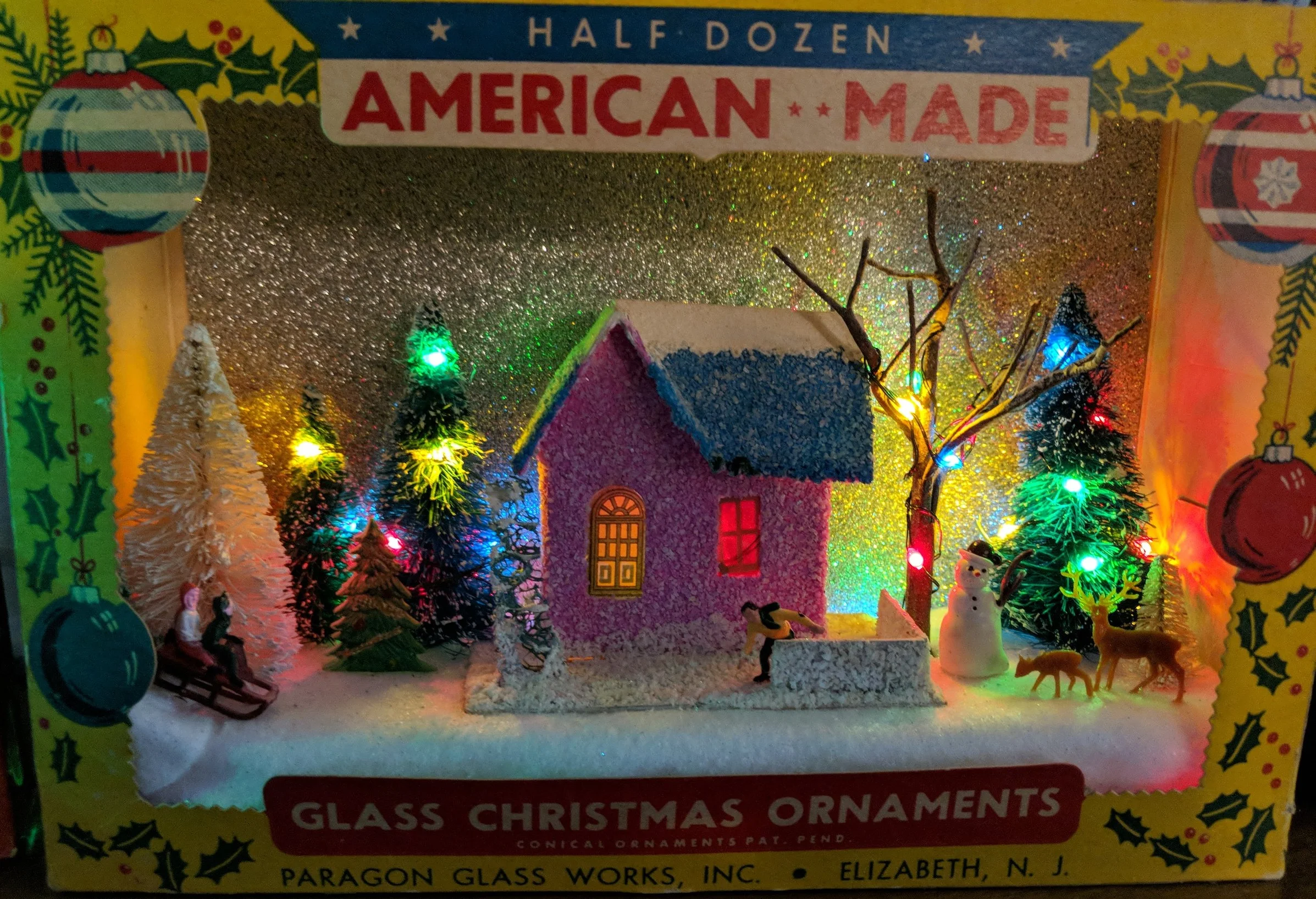 I began collecting my own Shiny Brites and Putz houses about 15 years ago. I had a modest collection for a while, but after joining a Christmas collector’s group, I found that I had an abundance of vintage items, some pristine, some damaged. I hated seeing the damaged items going to waste, so I began to build dioramas in some of the old ornament boxes I had, using these flawed items. I would carefully place them among bottle brush trees to hide their blemishes, again, giving new life to something old and forgotten. I enjoyed creating these so much that I started collecting more vintage items and boxes, always looking for unique pieces to tell tiny stories. These bits of boxed nostalgia bring smiles and laughter, akin to watching a child look in a department store window at Christmas. Often whimsical, and sometimes comical, I cherish the joy these creations bring to my customers.